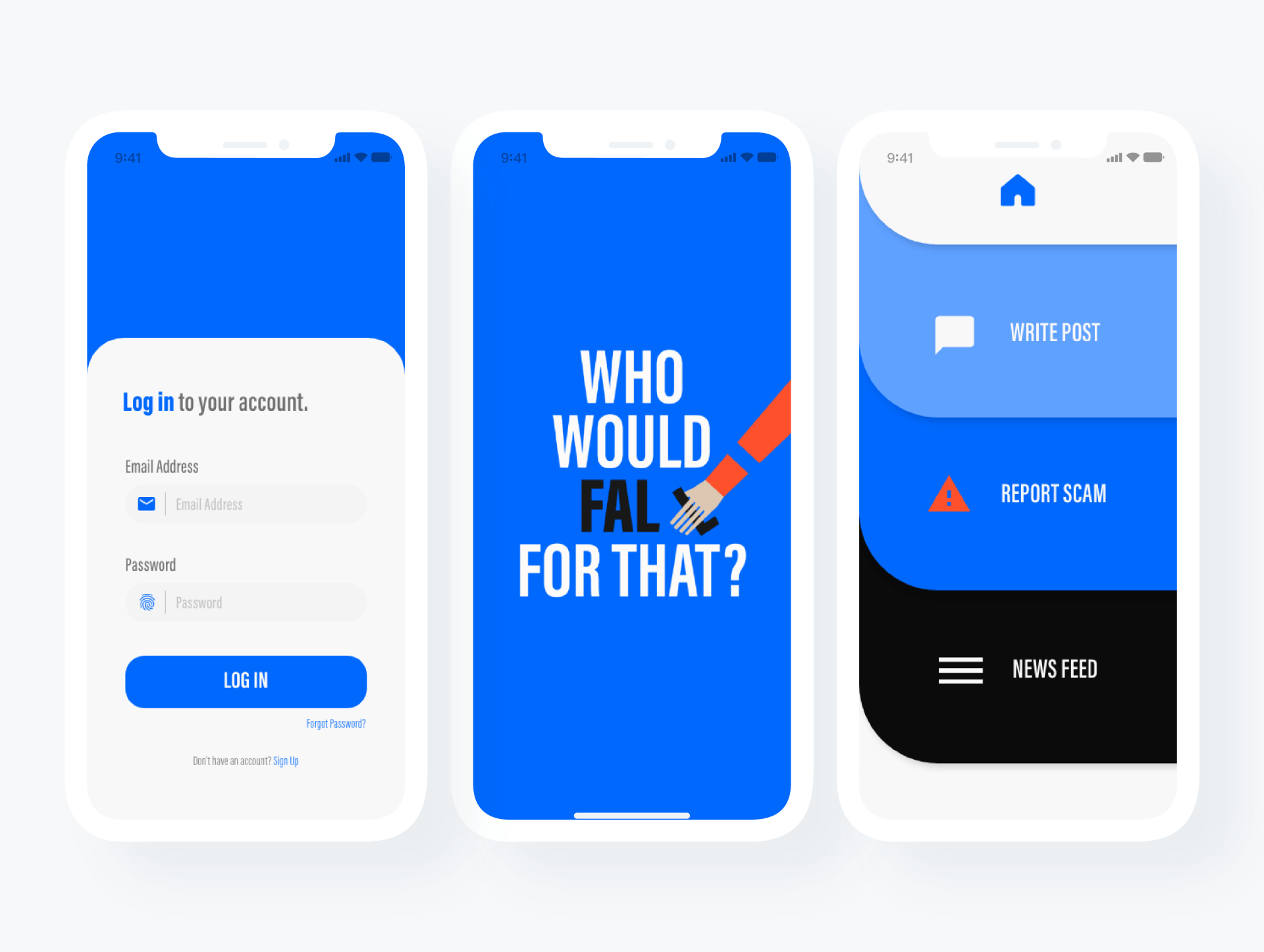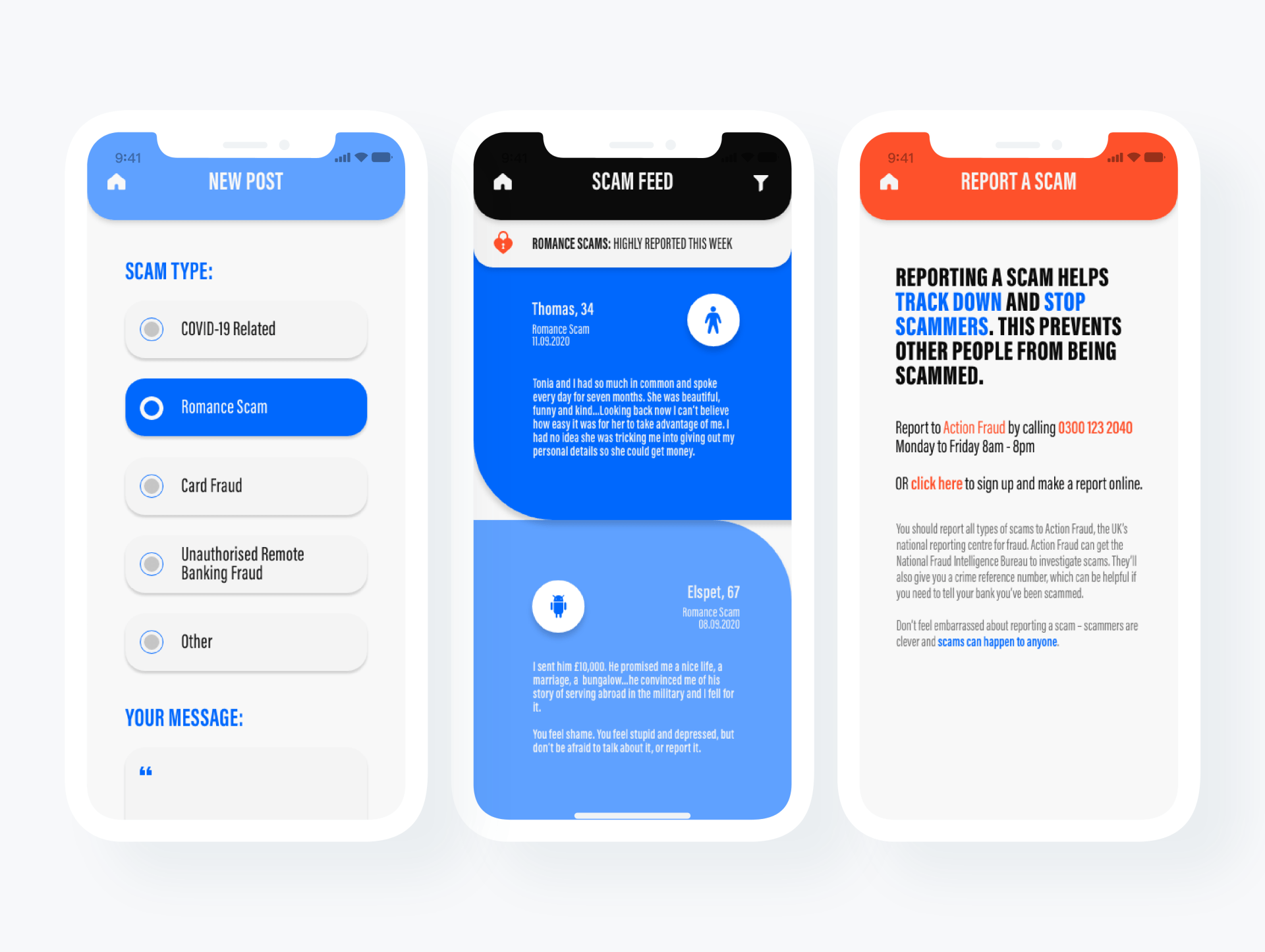 The app is designed to be a sleek, easy to use tool for community discussion and support in relation to online scam and fraud. Users can alert others of potential scams as well as read of other’s experiences to feel less alone, embarrassed and isolated. The aim is to spread awareness and through this, decreasing the number of scam victims. A key aspect I wanted to target within this campaign and app concept was to remove the element of shame that historically comes hand in hand with being scammed. As the app is community led, it creates a sense of togetherness and safety.