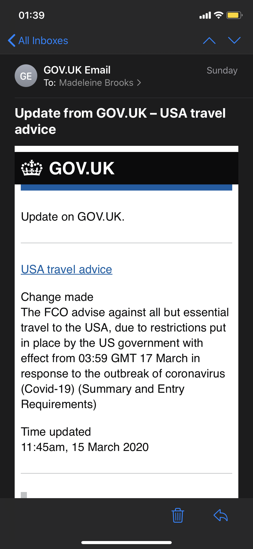 It’s crazy how much things have changed since last week when I was in New York. All my friends back in England have had their universities closed, and right now it seems that my living situation is better than that in England and the rest of Europe. However, I’m sure that soon enough the US will begin locking down states. Right now, restaurants are still open for takeaways, and cafes are open. This has been nice because there are still people out and about trying to get on with their day to day lives which makes me feel safer. Who knows how things are going to change though.