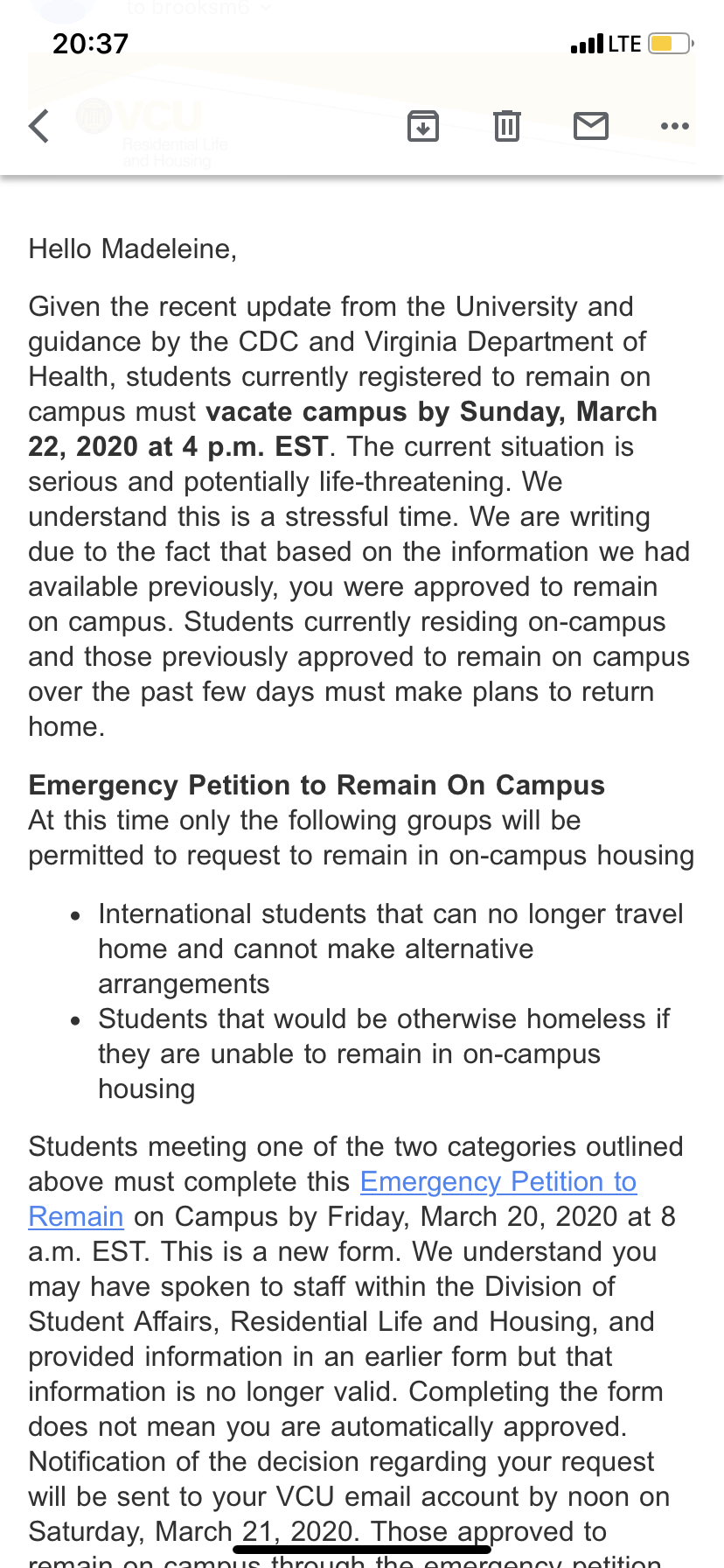 Yara currently cannot get back into Qatar for two weeks, so she’s planning on booking a flight home as soon as her airport opens again. Right now, I’m really confused about what to do; I don’t want to have to leave Richmond early, but the experience isn’t going to be the same now as last semester. I also don’t want to be left alone if the majority of the other international students have left. This week the situation has changed so much, therefore, I’m just going to take each day as it comes and if I need to book a next day flight then I will.